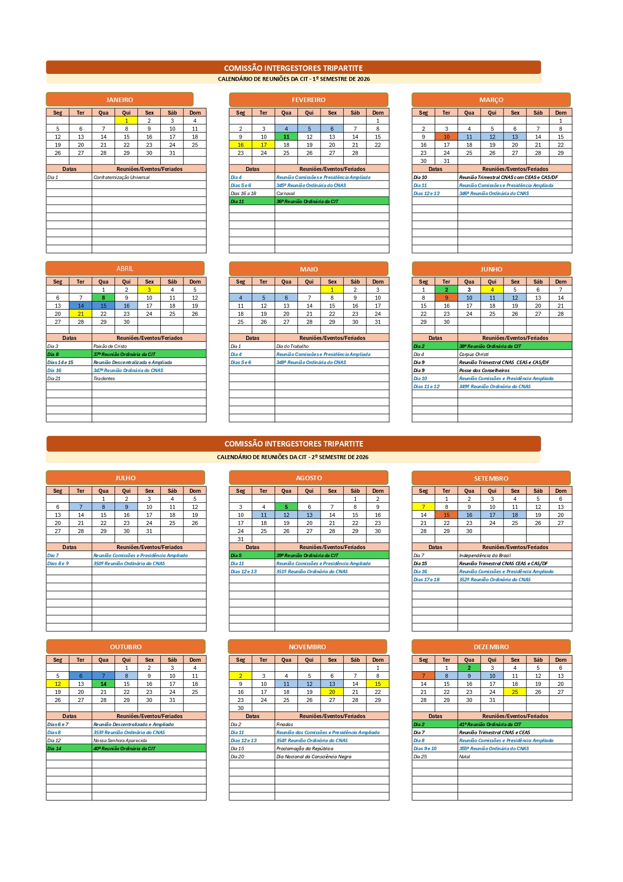 A CIT é constituída por 5 representantes titulares e 5 suplentes de cada ente federativo: representando a União, o Ministério do Desenvolvimento e Assistência Social, Família e Combate à Fome/ MDS, representando os Estados, o Fórum Nacional de Secretários Estaduais de Assistência Social/Fonseas e representando os municípios, o Colegiado Nacional de Gestores Municipais de Assistência Social/Congemas. As reuniões acontecem bimestralmente.