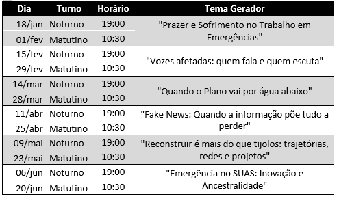 Você está convidada(o) a participar de uma série única e enriquecedora de Rodas de Conversa online, explorando tópicos cruciais no contexto de crises emergenciais, em um espaço de diálogo aberto e acolhedor. Em um cenário de constantes desafios, esses encontros quinzenais buscam promover um ambiente de trocas experienciais, tanto técnicas quanto emocionais, mediadas por especialistas em situações emergenciais.