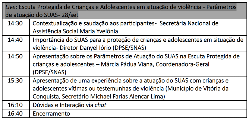 Na próxima terça-feira, 28/09, a Secretaria Nacional de Assistência Social (SNAS) realizará live aberta ao público sobre a atuação do Sistema Único de Assistência Social (SUAS) com relação à Lei da Escuta Protegida (nº 13.431/2017), que estabelece o Sistema de Garantia de Direitos para proteção de crianças e adolescentes vítimas ou testemunhas de violência, alterando o ECA (Lei nº 8.069/ 1990).