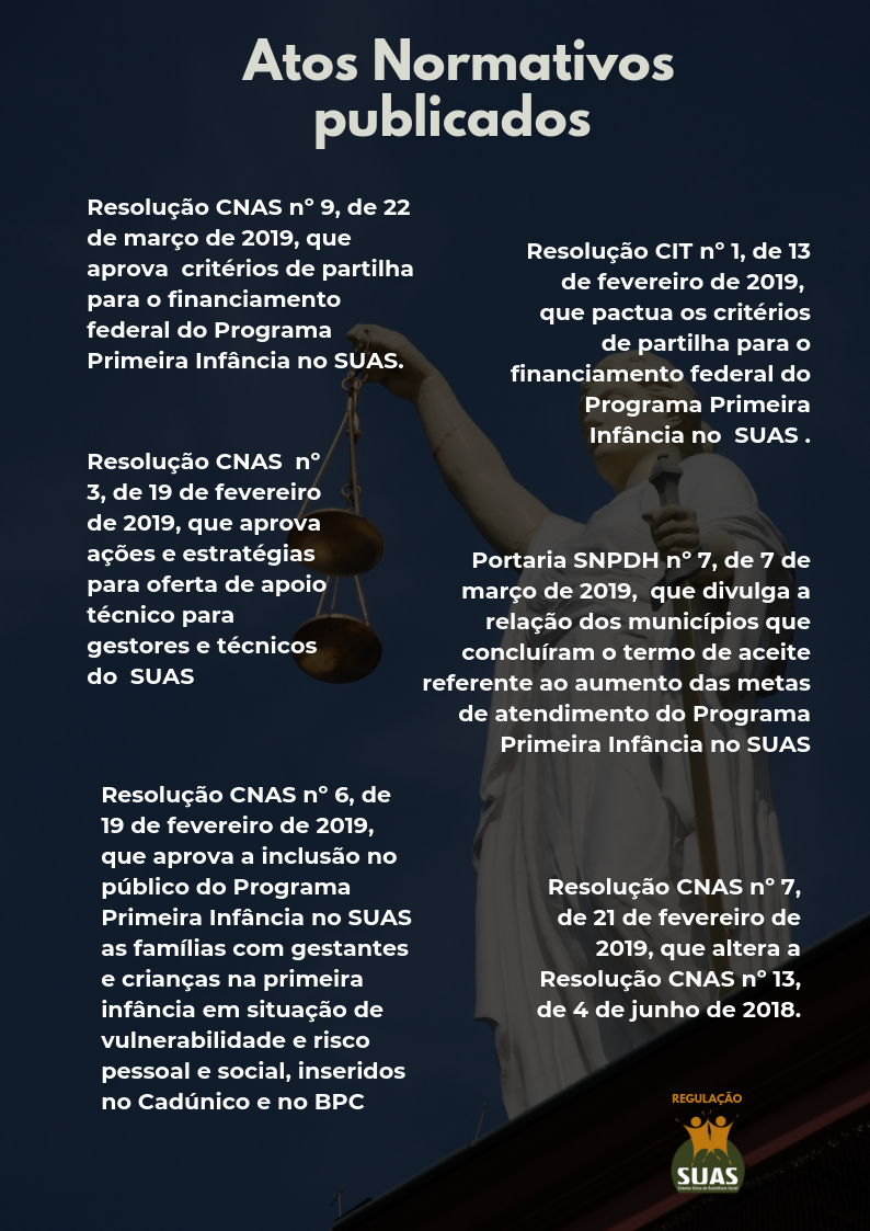 - Resolução nº 1, de 13 de fevereiro de 2019 da Comissão Intergestores Tripartite – CIT, que pactua os critérios de partilha para o financiamento federal do Programa Primeira Infância no Sistema Único de Assistência Social – SUAS para os estados e Distrito Federal;