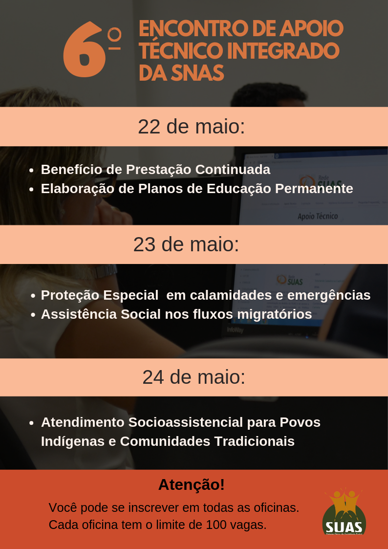 - As datas de realização dos encontros de Apoio Técnico serão disponibilizadas sempre no mês anterior, ficando a critério do estado, do município ou do Distrito Federal a escolha da data para sua participação, que deverá ser confirmada pela SNAS.