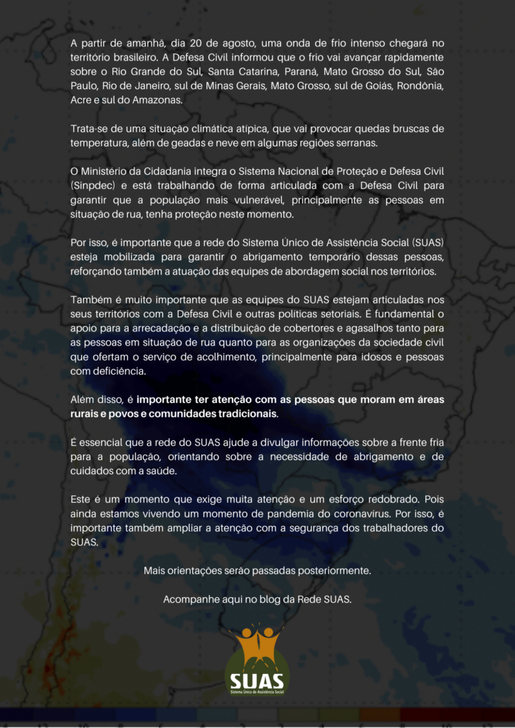 É essencial que a rede do SUAS ajude a divulgar informações sobre a frente fria para a população, orientando sobre a necessidade de abrigamento e de cuidados com a saúde.