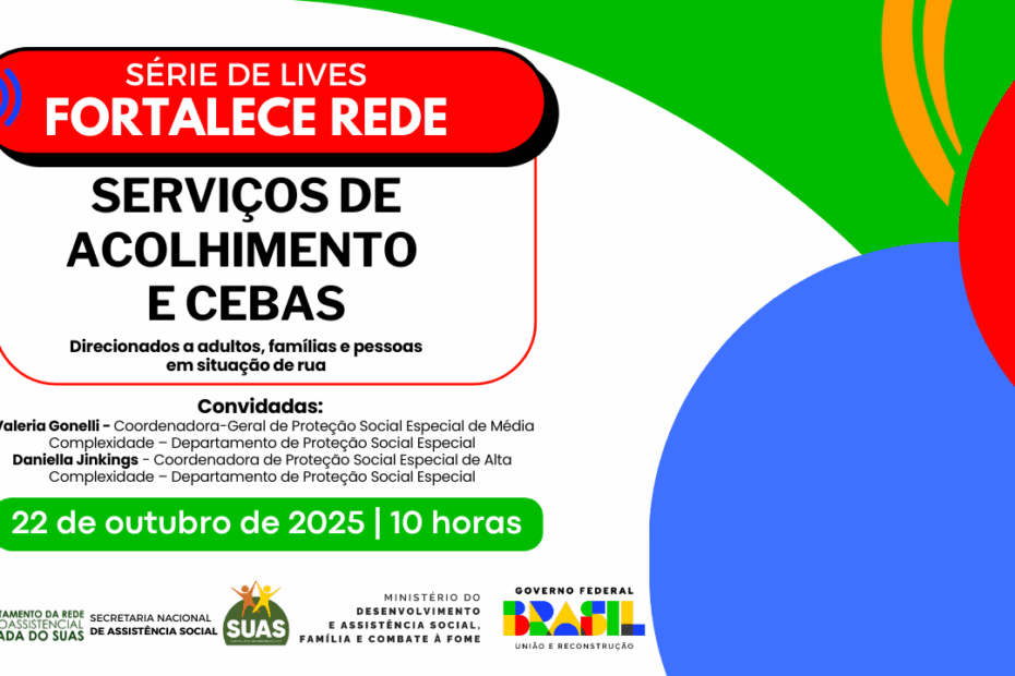 Nesta quarta-feira, 22 de outubro, teremos a 7ª live do Ciclo Fortalece Rede, com o tema “Serviços de Acolhimento e CEBAS”, direcionados a adultos, famílias e pessoas em situação deContinue a ler »Fortalece Rede debate sobre “Serviços de Acolhimento e CEBAS” no próximo dia 22/10