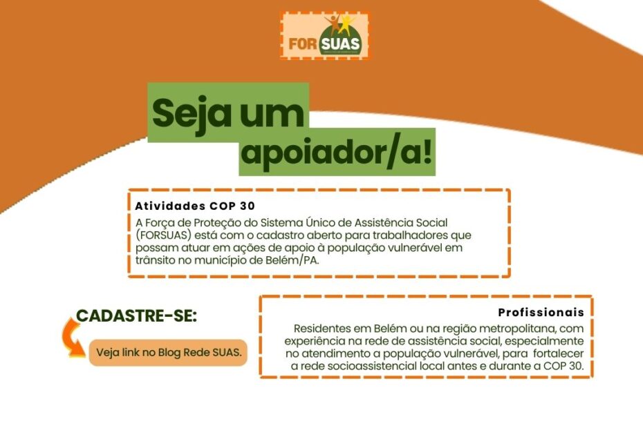A Força de Proteção do Sistema Único de Assistência Social (FORSUAS) está com o cadastro aberto para novos apoiadores que possam atuar em ações de apoio à população em situaçãoContinue a ler »COP 30: FORSUAS ABRE CADASTRO PARA APOIADOR/A