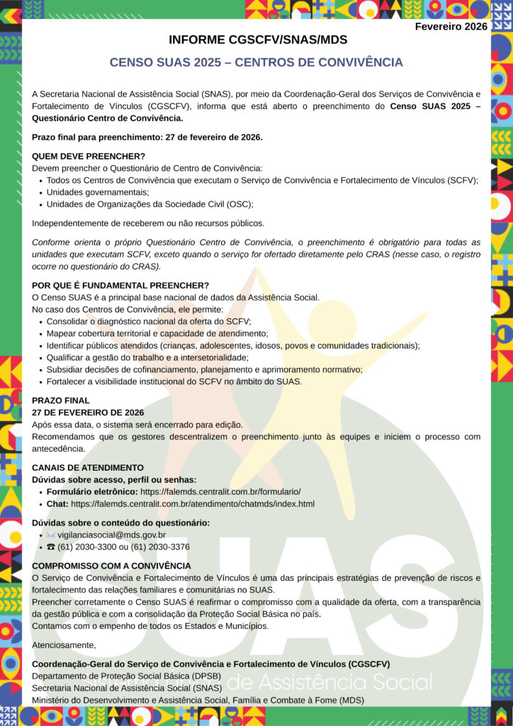 A Secretaria Nacional de Assistência Social (SNAS) informa que está aberto o preenchimento do Censo SUAS 2025 – Questionário Centro de Convivência.