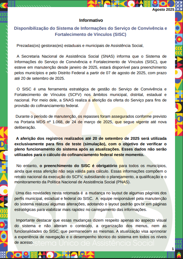 O SISC foi reaberto a partir do dia 07 de agosto e está disponível para acesso e preenchimento pelas equipes estaduais e municipais.