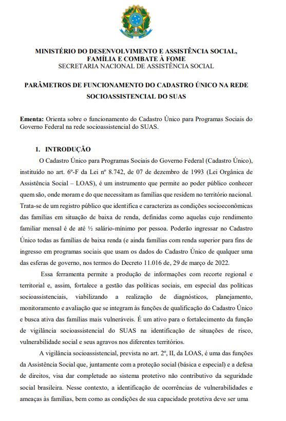 INTRODUÇÃO: O Cadastro Único para Programas Sociais do Governo Federal (Cadastro Único), instituído no art. 6º-F da Lei nº 8.742, de 07 de dezembro de 1993 (Lei Orgânica de Assistência Social – LOAS), é um instrumento que permite ao poder público conhecer quem são, onde moram e do que necessitam as famílias que residem no território nacional. Trata-se de um registro público que identifica e caracteriza as condições socioeconômicas das famílias em situação de baixa de renda, definidas como aquelas cujo rendimento familiar mensal é de até ½ salário-mínimo por pessoa…