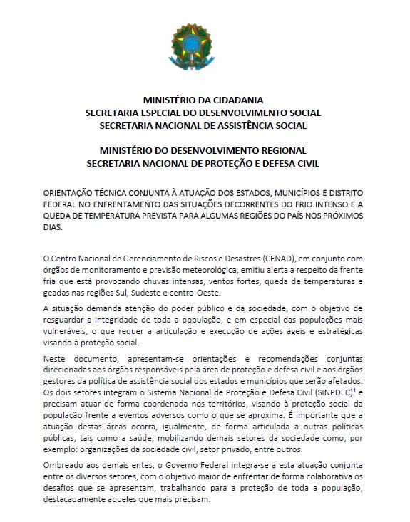 As Orientações Técnicas Conjunta da SNAS e da Defesa Civil recomendam um conjunto de medidas e orientações para a atuação dos entes federados no enfrentamento das situações a respeito da frente fria que está provocando chuvas intensas, ventos fortes, queda de temperaturas e geadas nas regiões Sul, Sudeste e Centro-Oeste.