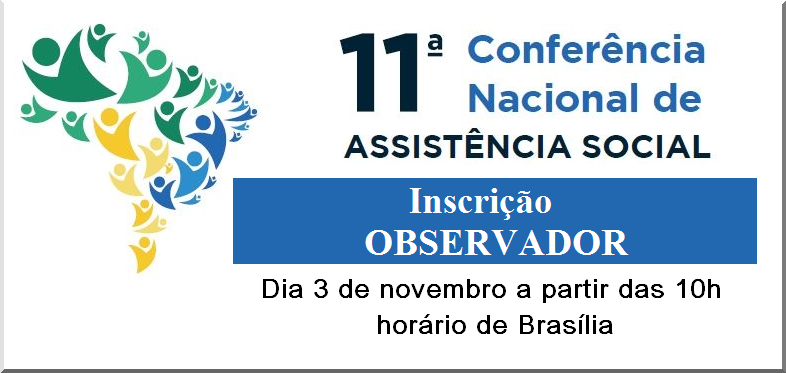 O Conselho Nacional de Assistência Social – CNAS, abriu hoje (3/11) as inscrições para 300 vagas de observadores na 11ª Conferência Nacional de Assistência Social e encerrará no dia 9 de novembro às 23:59.