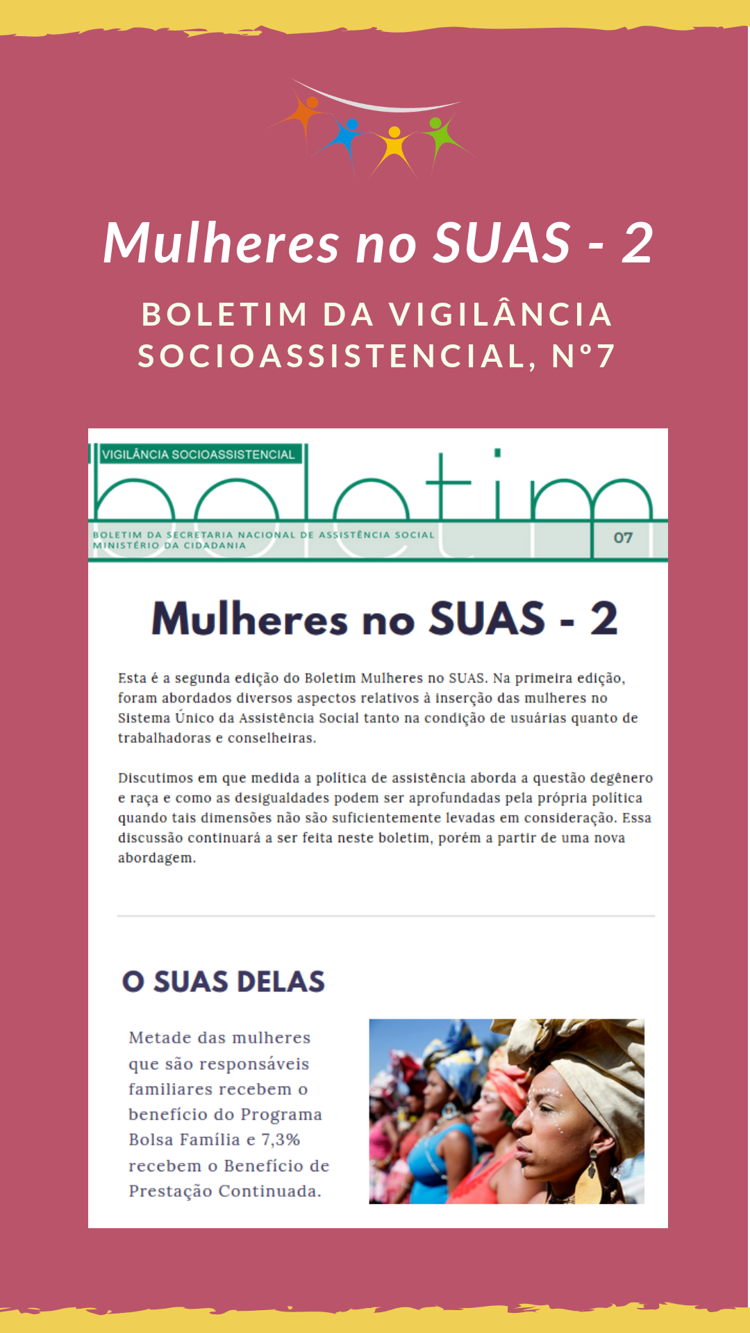 Leia a segunda edição do Boletim Especial sobre a participação das Mulheres no SUAS. Esta é a segunda edição do Boletim Mulheres no SUAS. Na primeira edição, foram abordados diversos aspectos relativos à inserção das mulheres no Sistema Único da Assistência Social tanto na condição de usuárias quanto de trabalhadoras e conselheiras. Discutimos em que medida a política de assistência aborda a questão de gênero e raça e como as desigualdades podem ser aprofundadas pela própria política quando tais dimensões não são suficientemente levadas em consideração. Essa discussão continuará a ser feita neste boletim, porém a partir de uma nova abordagem.