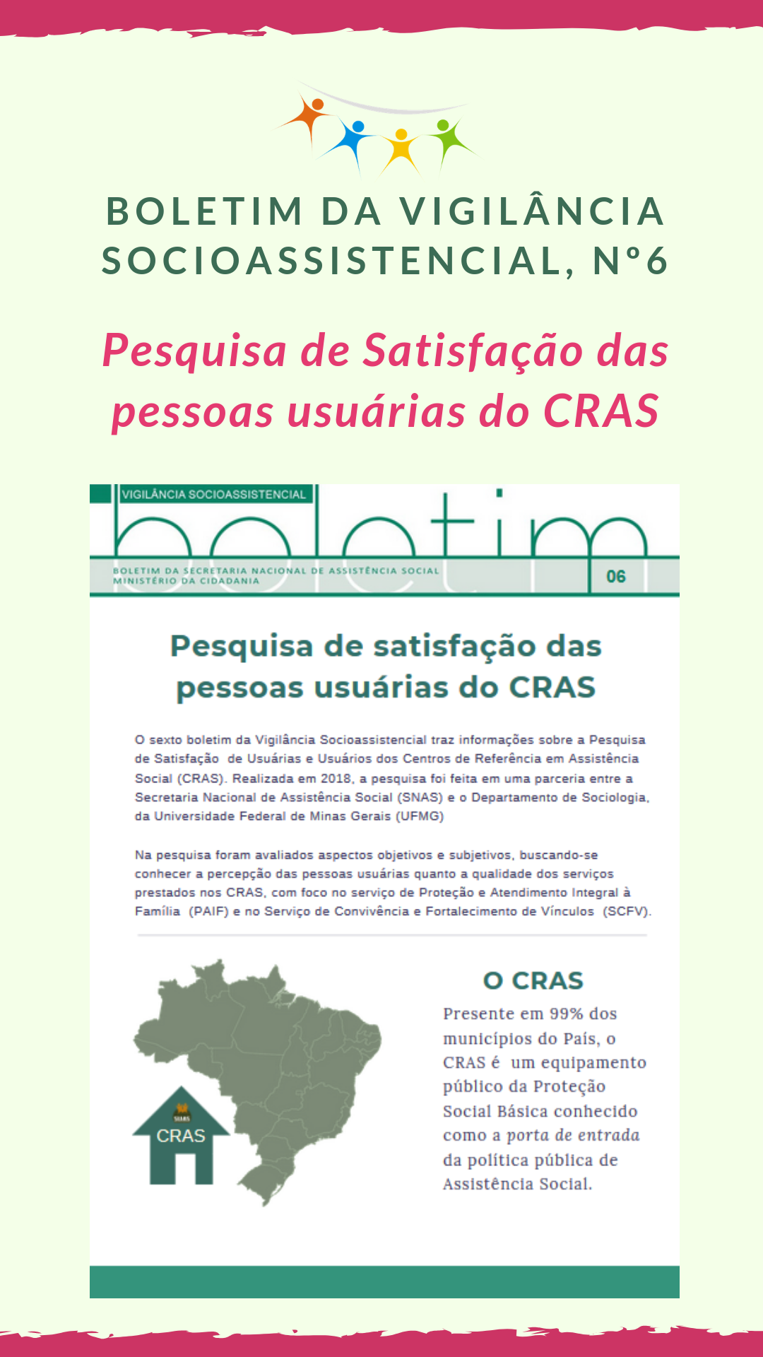 Leia o 6º Boletim da Vigilância Socioassistencial que trata da Pesquisa de Satisfação das pessoas usuárias do CRAS. Conheça os questionário e os instrumentos da pesquisa acessando o link: http://aplicacoes.mds.gov.br/snas/vigilancia/index4.php
