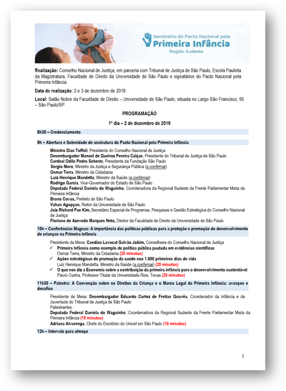 O Seminário do Pacto Nacional pela Primeira Infância – Região Sudeste propiciará o diálogo entre os diversos atores responsáveis pela atenção à primeira infância dos estados da região Sudeste, visando conhecer a realidade local e sensibilizar os operadores do direito, as equipes técnicas e os demais profissionais da rede de atenção à primeira infância sobre a importância do Marco Legal da Primeira Infância, fomentando a implementação da prioridade absoluta prevista no artigo 227 da Constituição Federal.