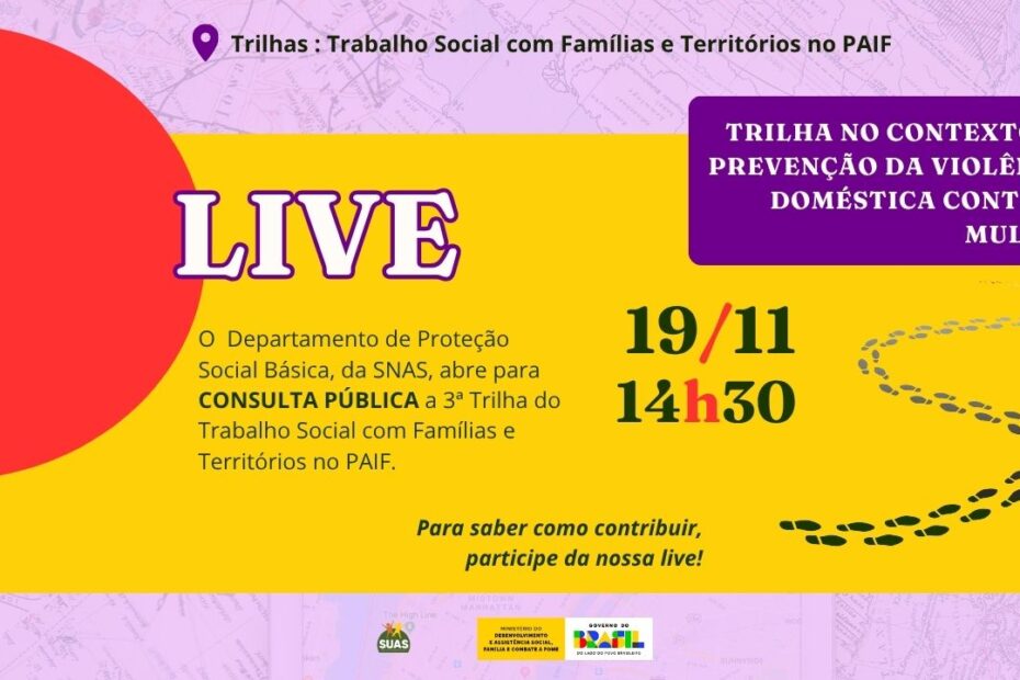 Próxima QUARTA-FEIRA (19/11), às 14h30, teremos LIVE DE ABERTURA PARA CONSULTA PÚBLICA da “Trilha do Trabalho Social com Famílias e Territórios no PAIF no contexto da Prevenção da Violência DomésticaContinue a ler »LIVE 19/11- Consulta Pública 3ª Trilha do Trabalho Social com Famílias e Territórios no PAIF
